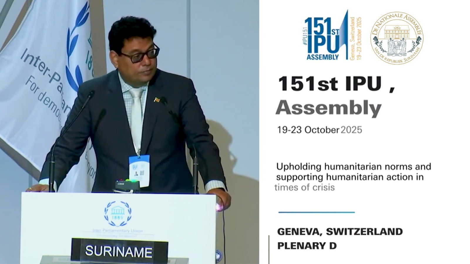 Deze uitdagingen stellen niet alleen de capaciteit van onze instellingen op de proef, maar ook de kracht van ons medeleven. Zo sprak drs. Asiskumar Gajadien de aanwezigen toe tijdens de 151ste Algemene Vergadering van de Interparlementaire Unie (IPU) op 20 oktober 2025 in Genève, Zwitserland.