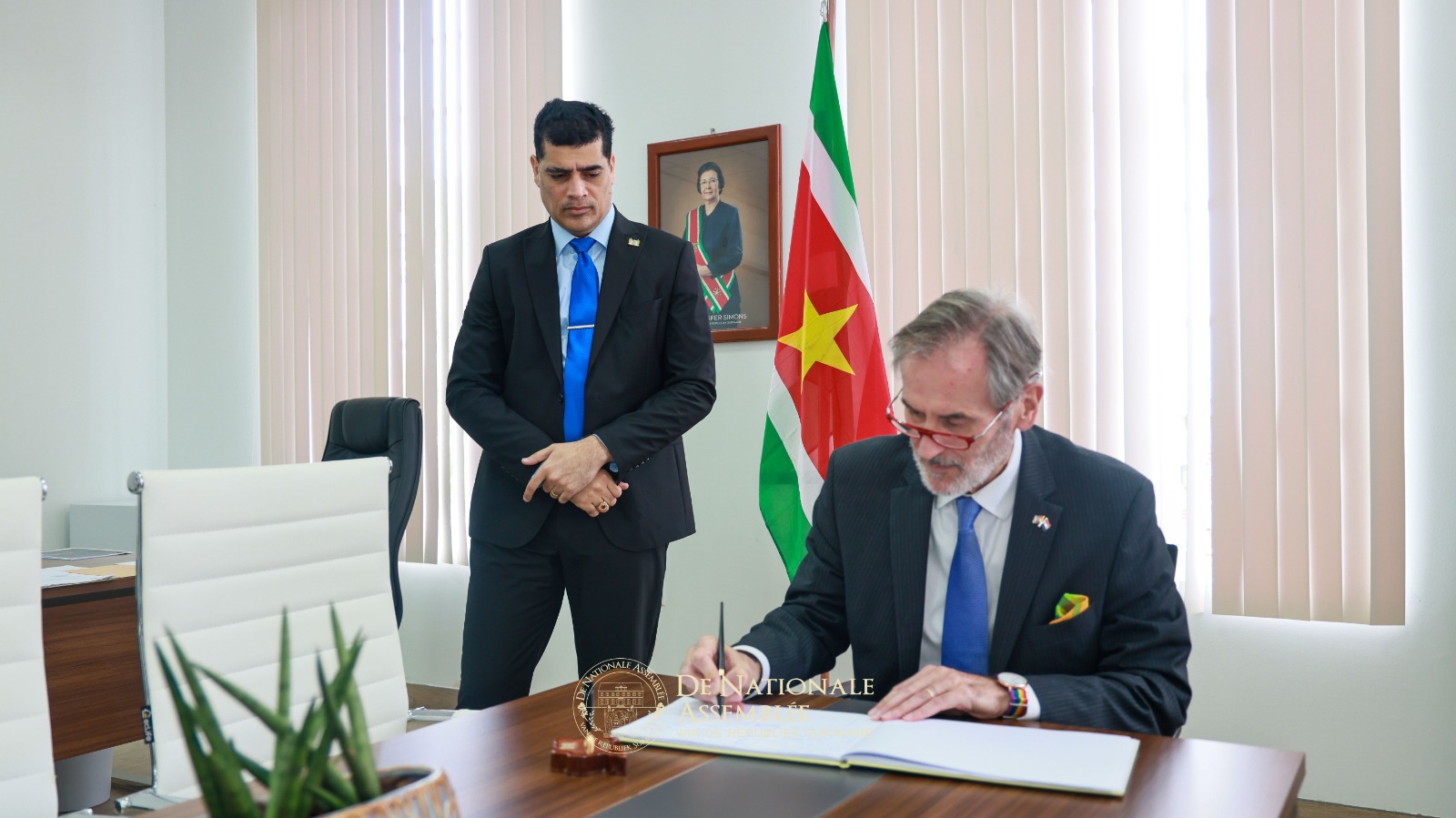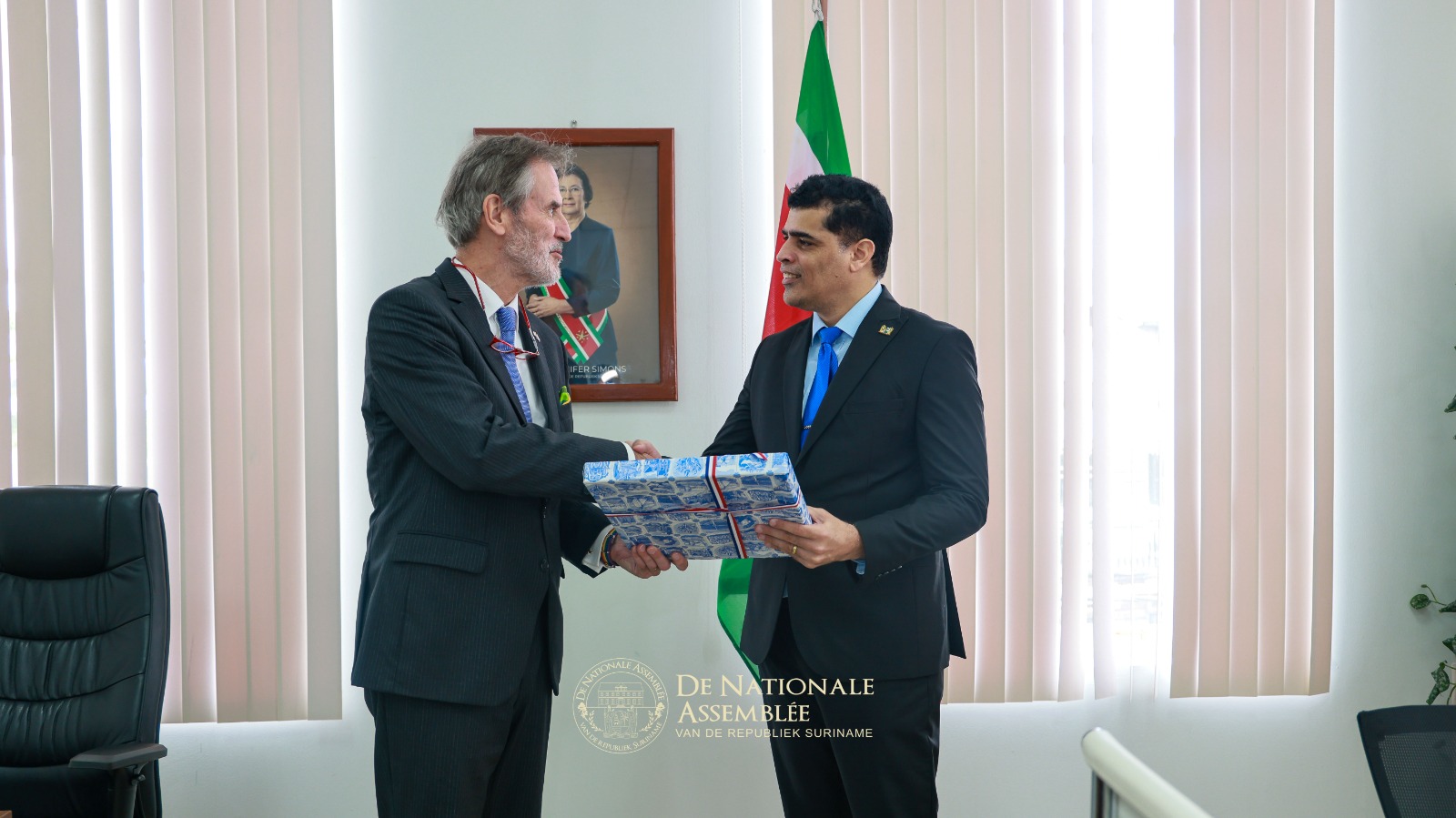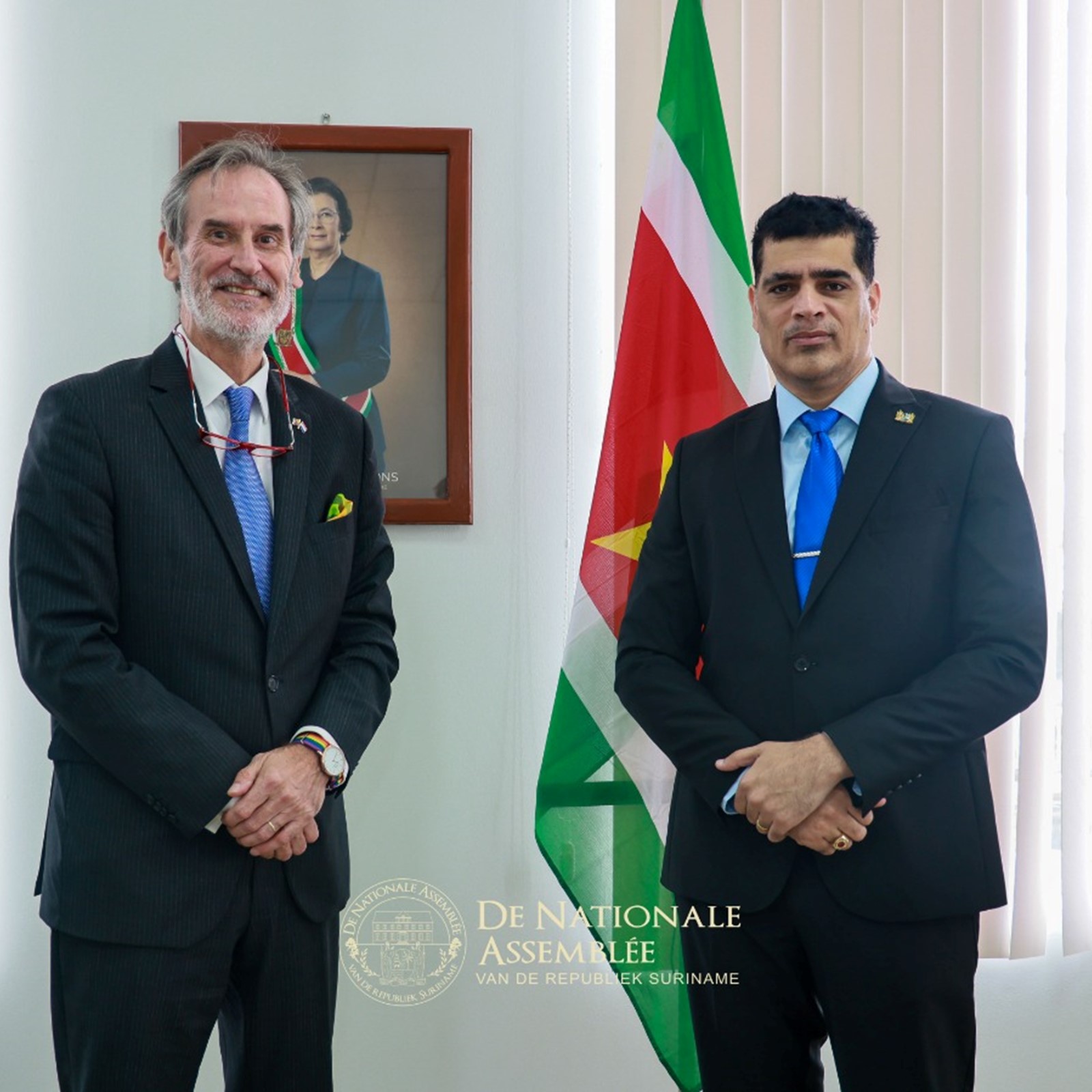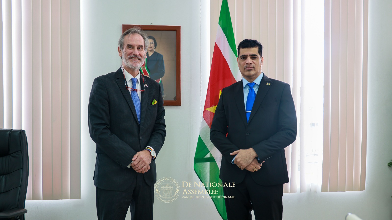 De ambassadeur van het Koninkrijk der Nederlanden, Walter Oostelbos, heeft op donderdag 30 oktober 2025 een kennismakingsbezoek gebracht aan de voorzitter van De Nationale Assemblée, dr. ir. Michael A. Adhin. Tijdens het onderhoud werd van gedachten gewisseld over de Trias Politica, een principe dat zowel Suriname als het Koninkrijk hoog in het vaandel dragen.