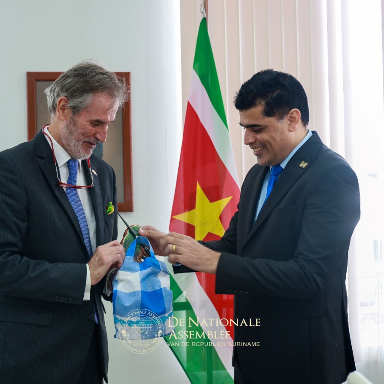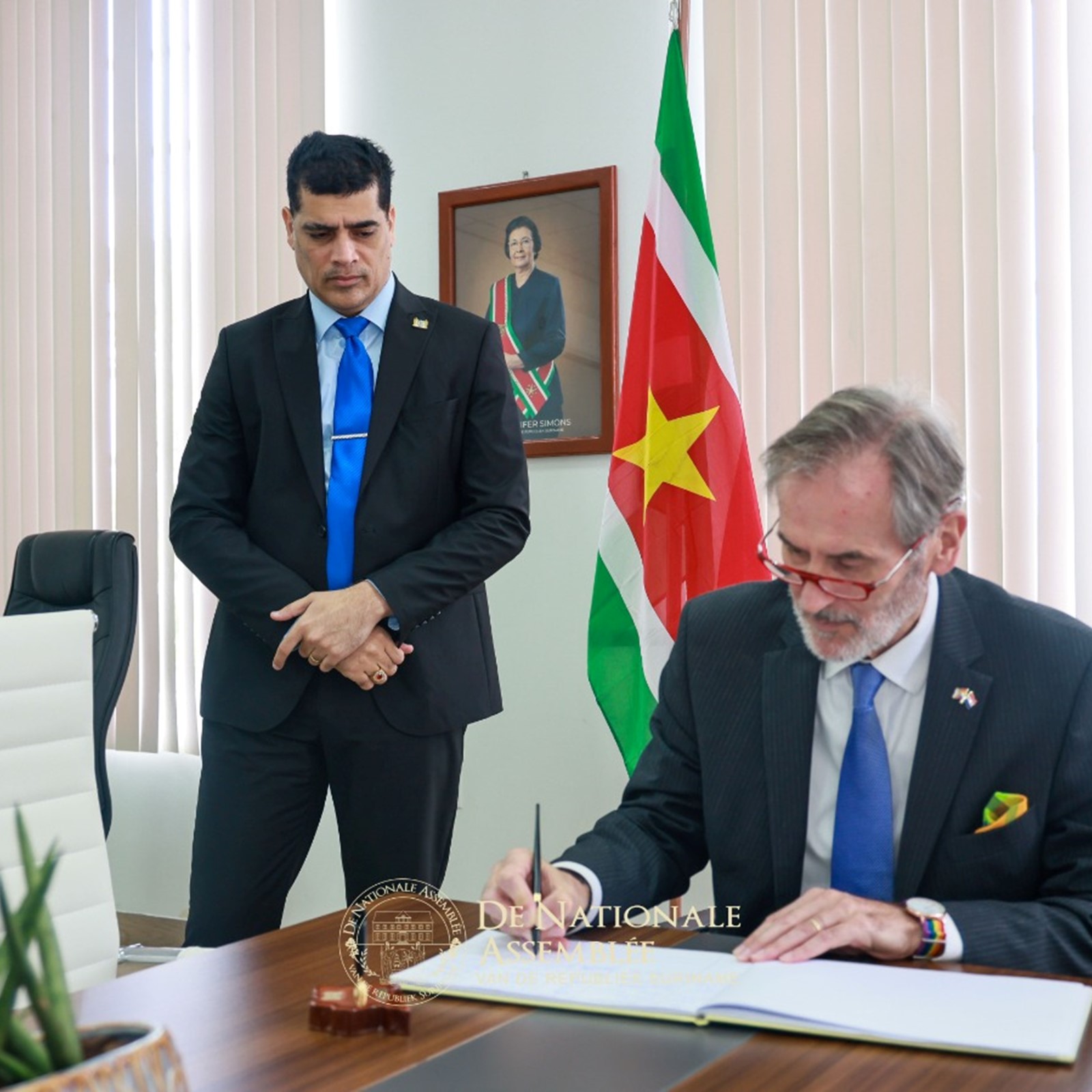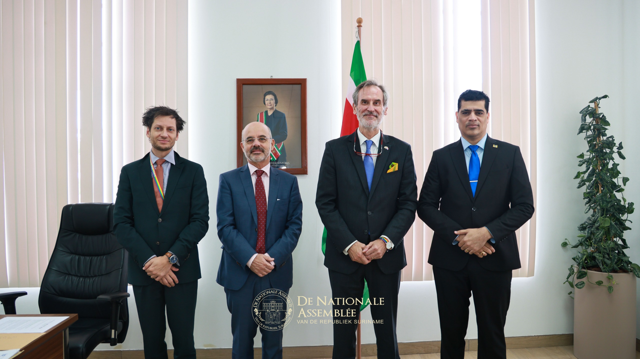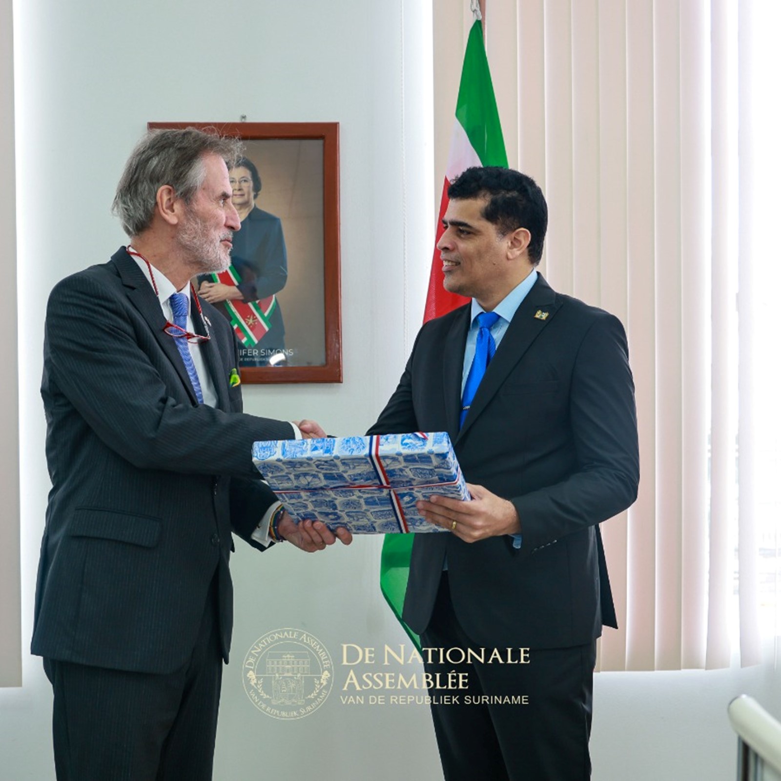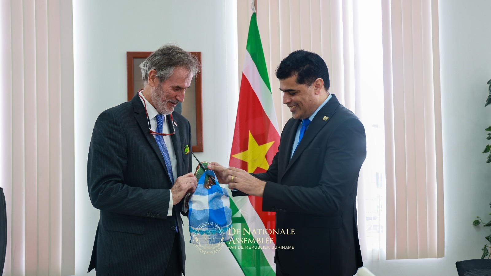De ambassadeur van het Koninkrijk der Nederlanden, Walter Oostelbos, heeft op donderdag 30 oktober 2025 een kennismakingsbezoek gebracht aan de voorzitter van De Nationale Assemblée, dr. ir. Michael A. Adhin. Tijdens het onderhoud werd van gedachten gewisseld over de Trias Politica, een principe dat zowel Suriname als het Koninkrijk hoog in het vaandel dragen.