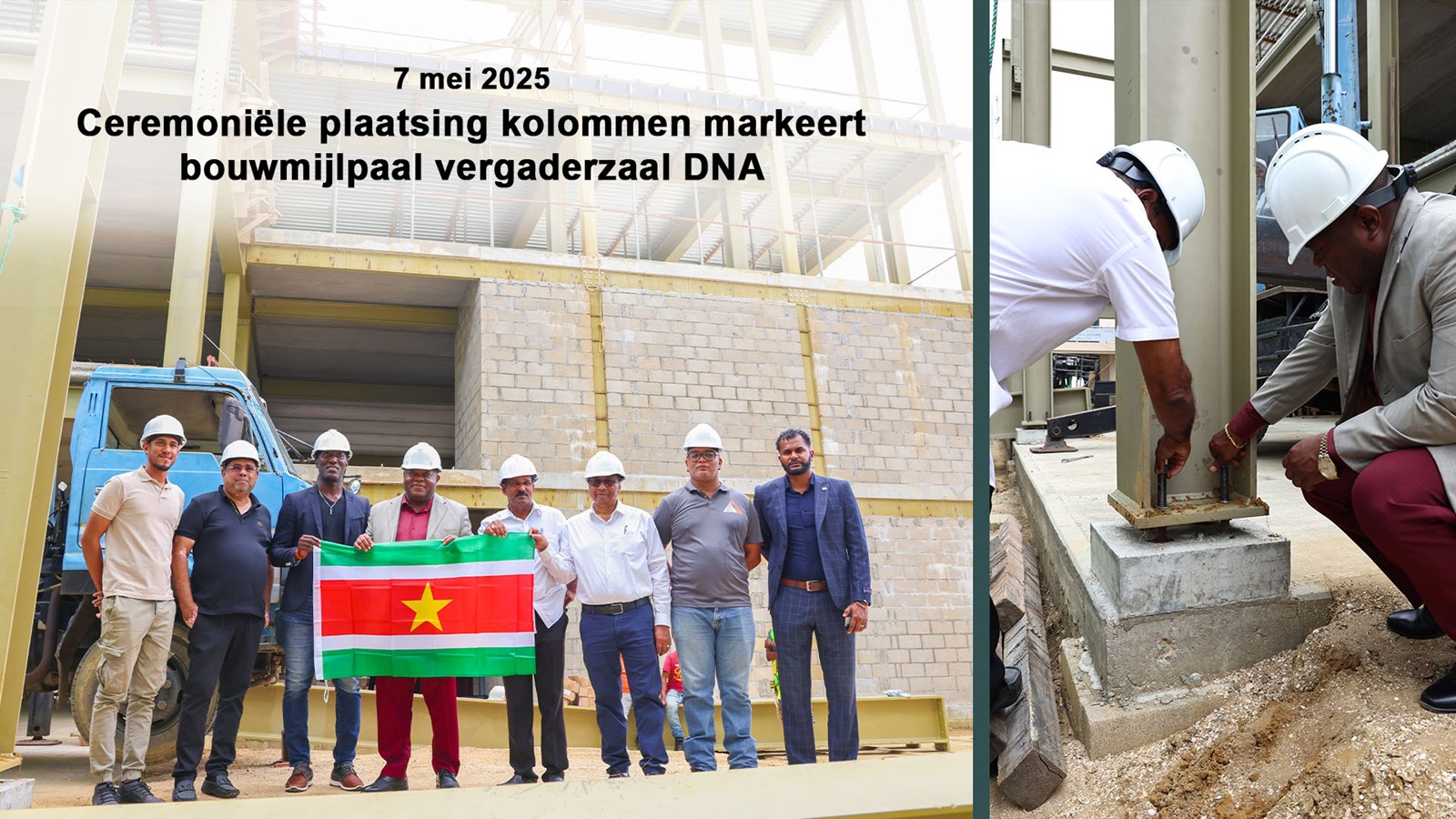 De bouw van de vergaderzaal van De Nationale Assemblée (DNA) op de hoek van Grote Combéweg en de Henck Arronstraat bereikte op woensdag 7 mei 2025 een mijlpaal. In aanwezigheid van DNA-voorzitter Marinus Bee, MSc, LL.B, en de voorzitter van de commissie Nieuwbouw, Mahinderkoemar Jogi, vond de ceremoniële plaatsing plaats van stalen kolommen en balken aan de buitenzijde van de in aanbouw zijnde vergaderzaal.