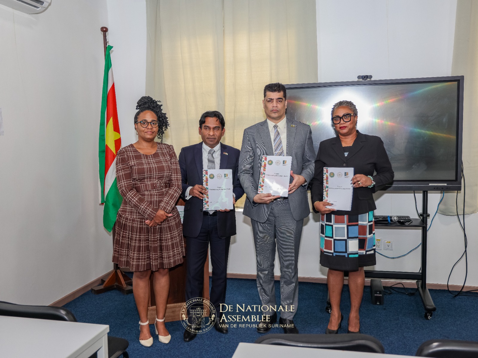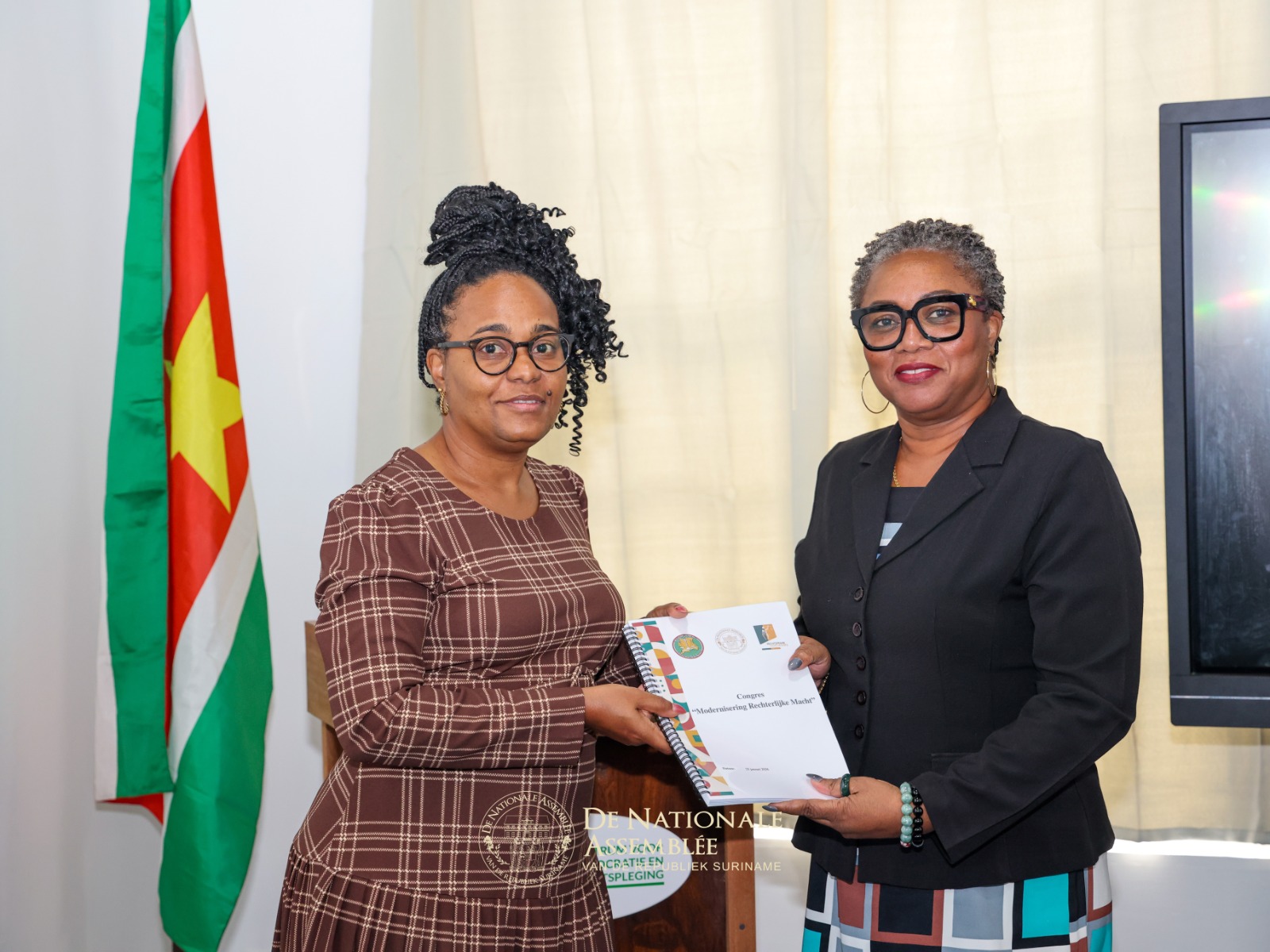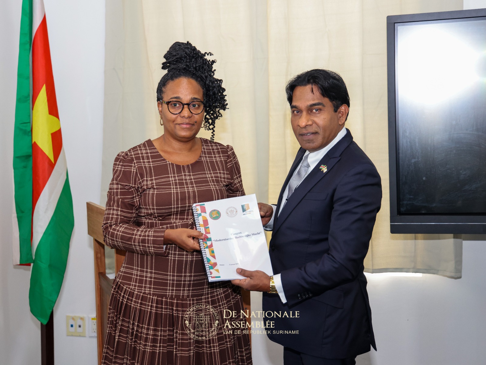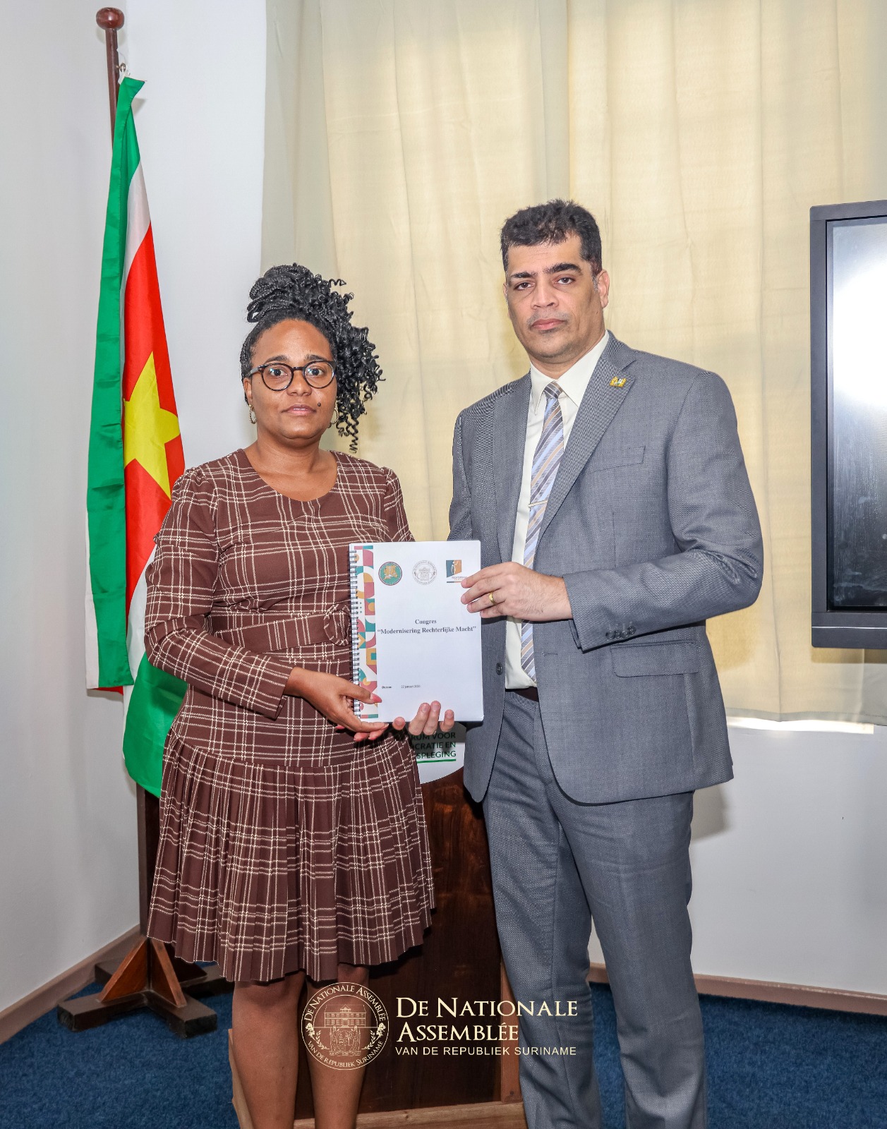 “Wij hebben een degelijk document ontvangen. De inzichten uit dit rapport worden meegenomen in de eerste ronde van de parlementaire behandeling, waarbij wij zorgvuldig, stap voor stap werken aan duurzame vernieuwing die rechtszekerheid, voorspelbaarheid en vertrouwen biedt aan alle Surinamers.” Met deze woorden nam de voorzitter van De Nationale Assemblée (DNA), dr. ir. Michael A. Adhin, op vrijdag 30 januari 2026 een gestructureerd rapport in ontvangst uit handen van de directeur van het Centrum voor Democratie en Rechtspleging (CDR), Simone Koole.