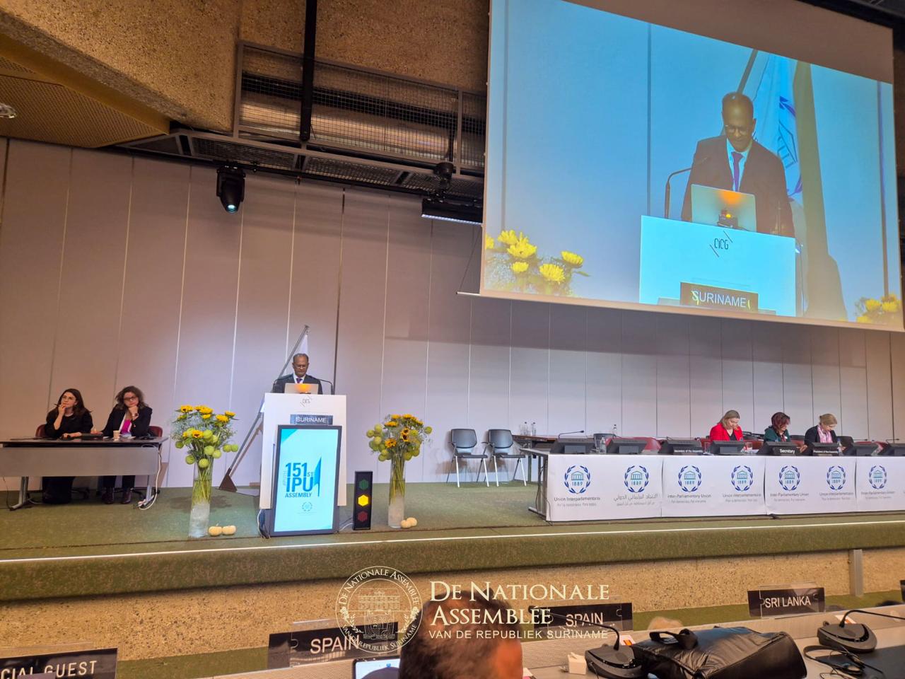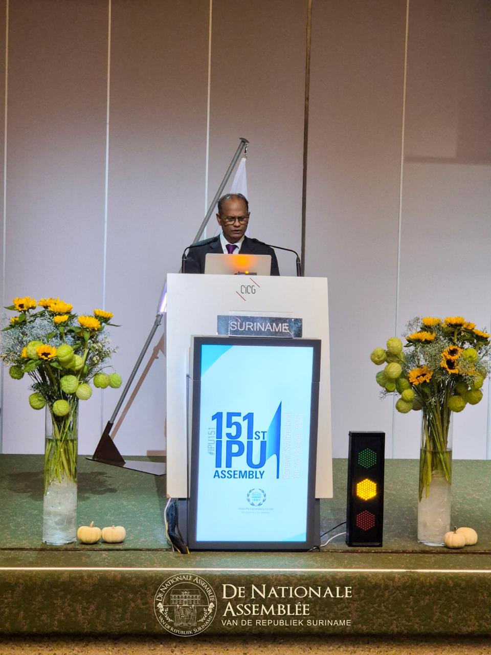 “Suriname is een land dat humanitaire waarden niet alleen predikt, maar ook in de praktijk brengt in de manier waarop mensen samenleven. Wij zeggen vaak dat Suriname ons eigen Verenigde Naties is.” Dat zei drs. Rabindre Parmessar tijdens zijn toespraak op de 151ste Algemene Vergadering van de Interparlementaire Unie (IPU) op 20 oktober 2025 in Genève, Zwitserland.